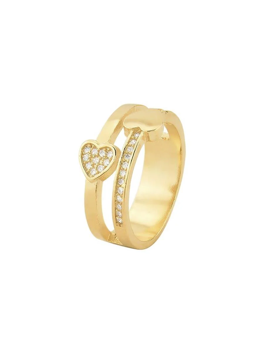 Anel com aro duplo e corações sendo um liso e outro cravejado, banhado a ouro 18K. Peça ideal para quem tem clientes apaixonadas! Delicado e super vendável, as peças com coração são uma ótima opção para se ter em estoque.
